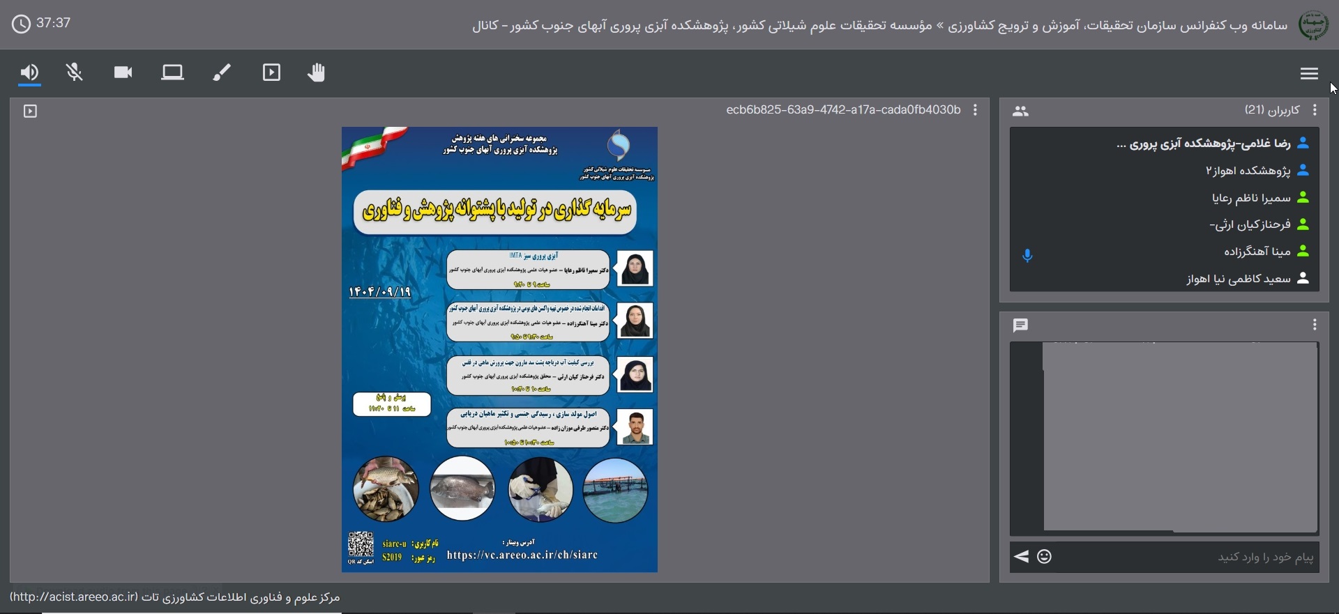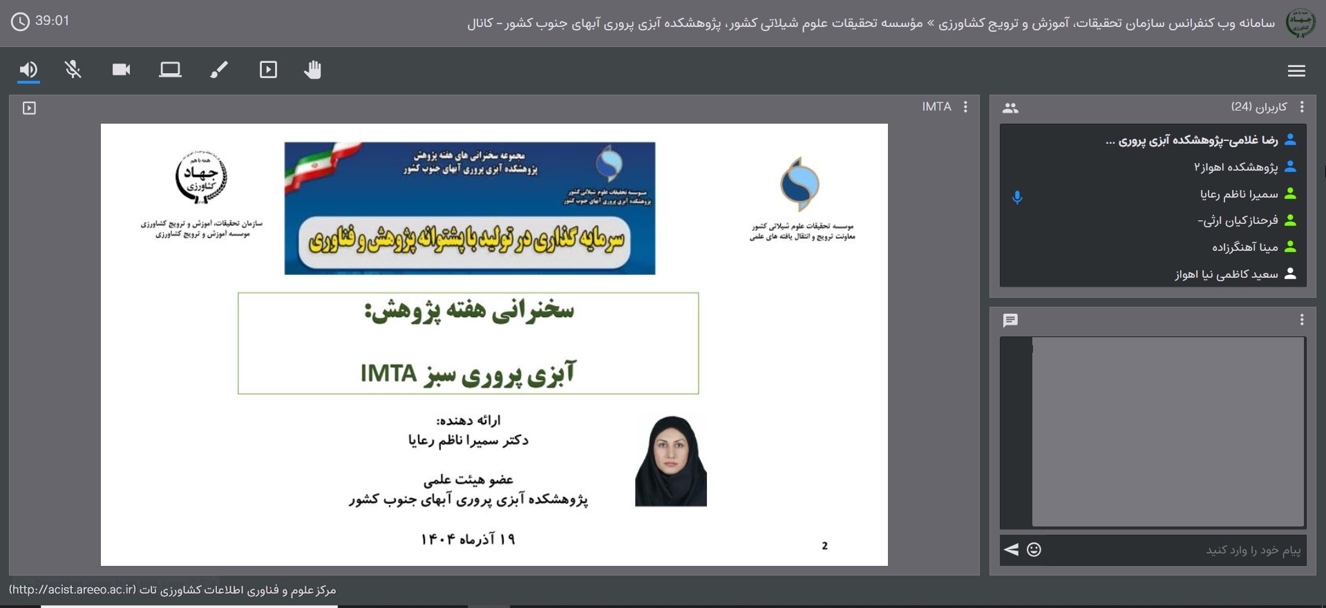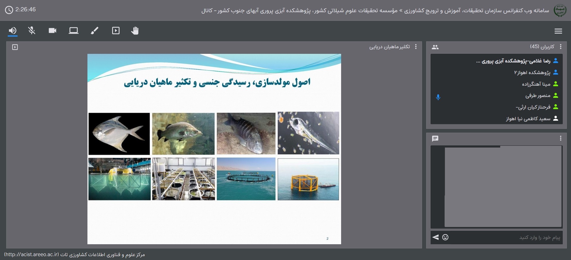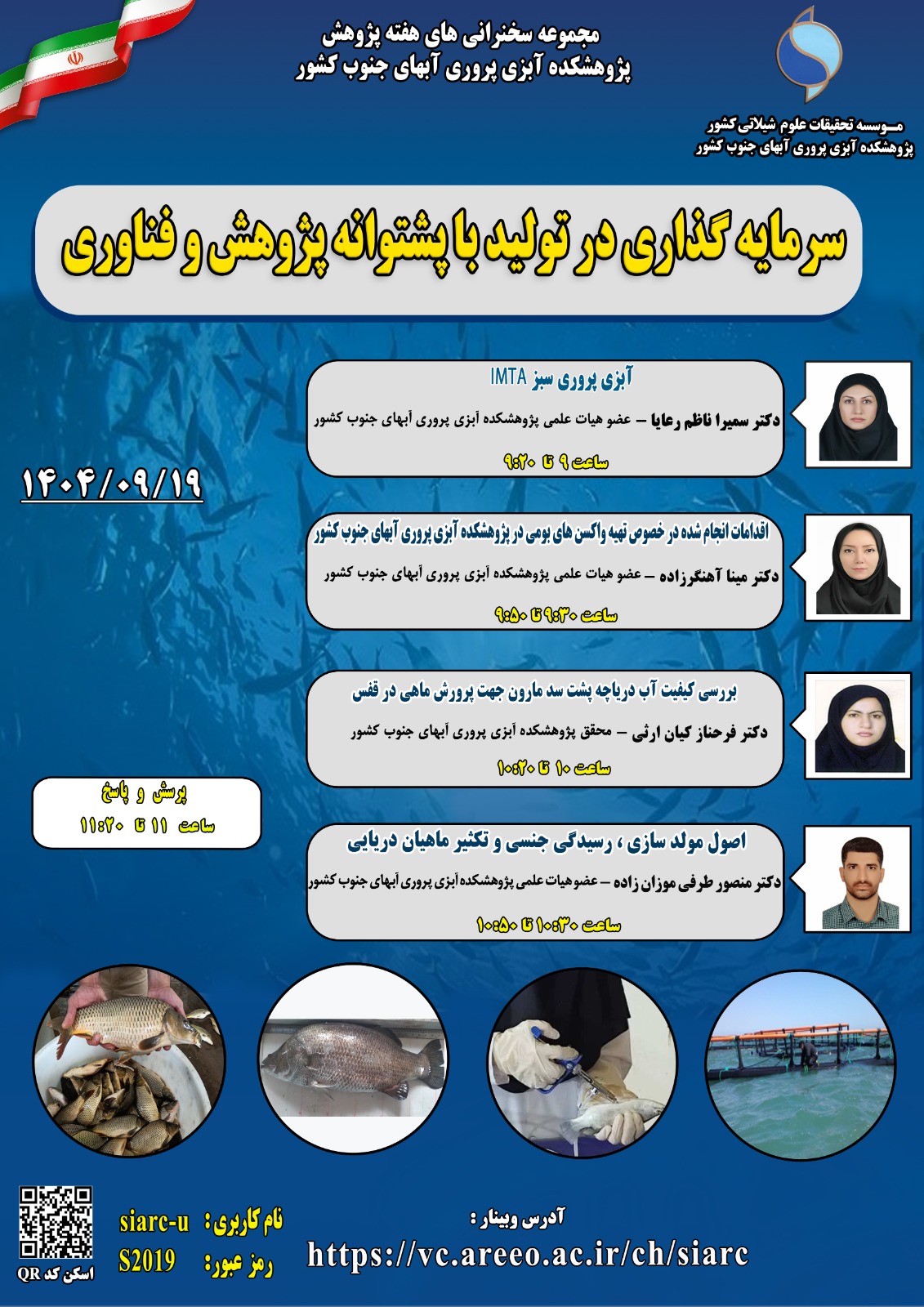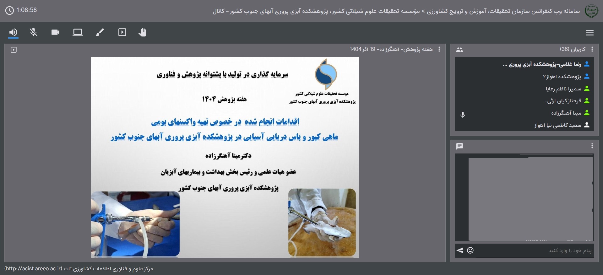 برگزاری سخنرانیهای وبیناری با محور سرمایهگذاری در تولید با پشتوانه پژوهش و فناوری در پژوهشکده آبزیپروری آبهای جنوب کشور مجموعه سخنرانیهای تخصصی به مناسبت هفته پژوهش در پژوهشکده آبزیپروری آبهای جنوب کشور بهصورت برخط برگزار شد. محور اصلی نشست، سرمایهگذاری در تولید با پشتوانه پژوهش و فناوری بود. در این نشست، سمیرا ناظم رعایا، مینا آهنگرزاده، فرحناز کیان ارثی و منصور طرفی موزان زاده به ایراد سخنرانی پرداختند و در پایان به سؤالات حاضرین پاسخ دادند. 1404/9/20 (13) (0) برگزاری سخنرانیهای وبیناری با محور سرمایهگذاری در تولید با پشتوانه پژوهش و فناوری در پژوهشکده آبزیپروری آبهای جنوب کشور به گزارش روابطعمومی پژوهشکده آبزیپروری آبهای جنوب کشور، مجموعه سخنرانیهای تخصصی به مناسبت هفته پژوهش با شعار سرمایهگذاری در تولید با پشتوانه پژوهش و فناوری، در تاریخ ۱۹ آذرماه سال جاری بهصورت برخط برگزار شد. این نشست با حضور پژوهشگران، متخصصان و علاقهمندان به حوزه آبزیپروری برگزار شد و فرصتی بود تا پژوهشهای جاری و ظرفیتهای فناورانه پژوهشکده در این صنعت بهروشنی معرفی شود.در این نشست سمیرا ناظم رعایا، مینا آهنگرزاده، فرحناز کیان ارثی و منصور طرفی موزان زاده اعضا هیئتعلمی و محققان پژوهشکده بهتفصیل به ابعاد مختلف روشهای مؤثر و فناورانه در تولید و پیشگیری از بیماریها پرداختند.در پایان، حاضرین در نشست با بحث و تبادل نظر، سؤالات خود را مطرح کردند و سخنرانان نیز به پرسشهای مخاطبان پاسخ دادند.